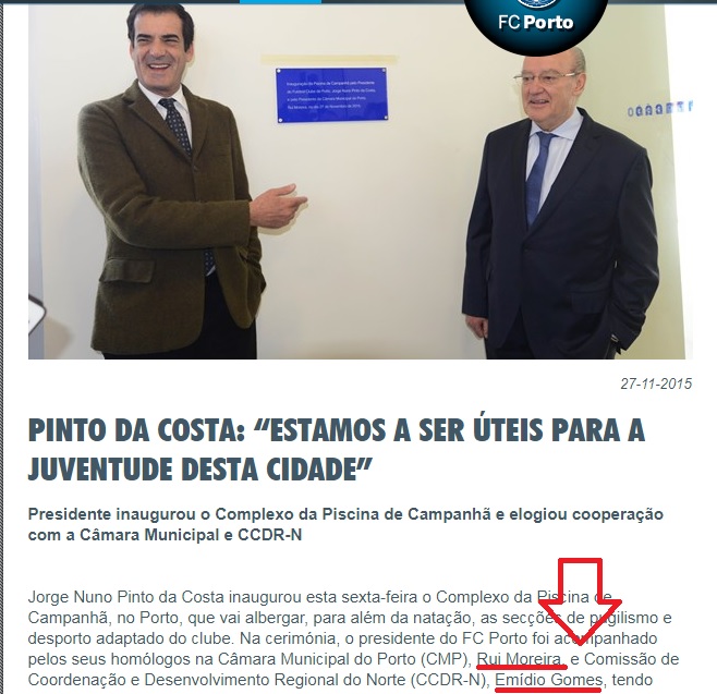 Foi durante o consulado de Emídio Gomes na CCDR-N que foi entregue ao FC Porto, tudo pago com dinheiros públicos, o Complexo da Piscina da Campanhã. Tudo embrulhado com um lacinho pelo presidente da CM Porto Rui Moreira, também ele um fanático do FC Porto e que se negou a comentar as Escutas do Apito Dourado, como bem se lembram.